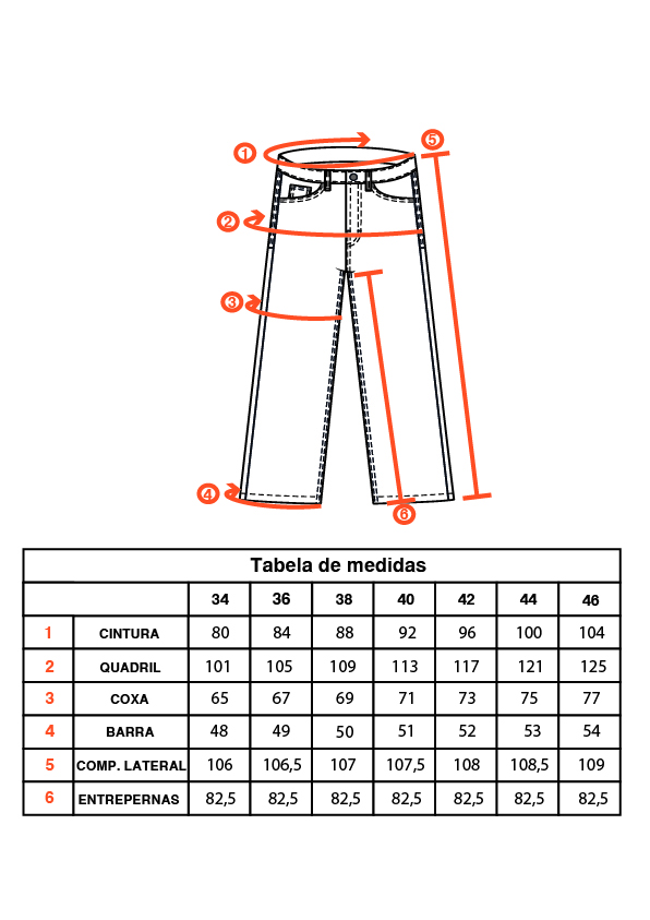 | BOLSOS | DOIS BOLSOS FRONTAIS EM FORMATO DE ARCO COM BOLSO RELÓGIO DO LADO DIREITO. DOIS BOLSOS POSTERIORES. |