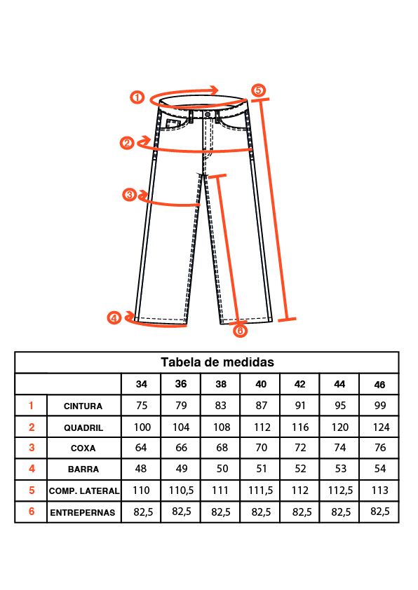 | BOLSOS | DOIS BOLSOS FRONTAIS EM FORMATO DE ARCO COM BOLSO RELÓGIO DO LADO DIREITO. DOIS BOLSOS POSTERIORES. |